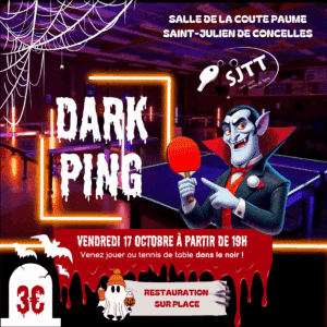 Dark-Ping 2025 Date Oct 17 2025 Expired! Heure 19h00 - 19h00 Tarif 3.00 Lieu Salle de la Courte Paume Saint Julien de Concelles Organisateur Saint Julien Tennis de Table